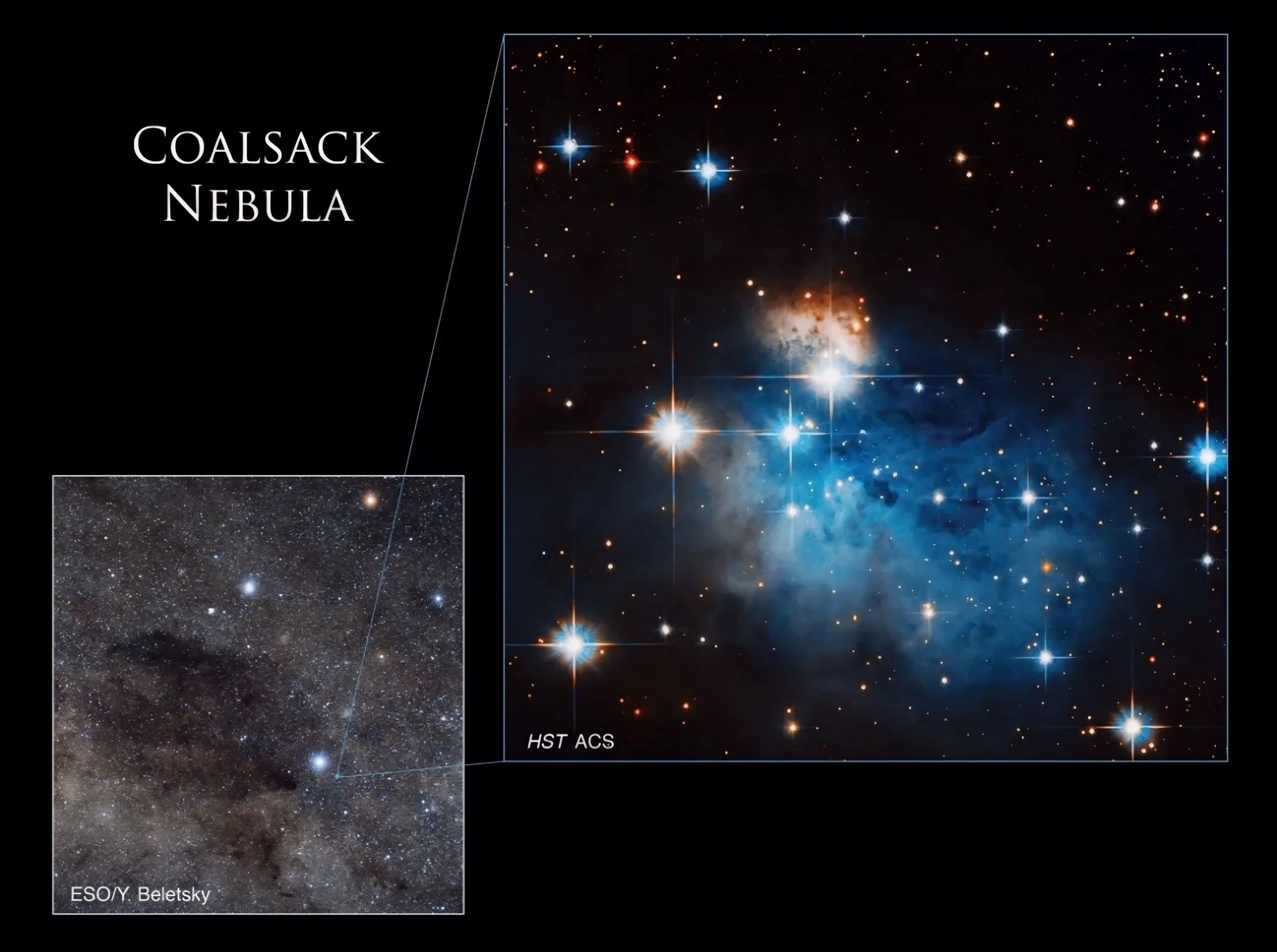 The painting captures a small region on the edge of the inky Coalsack Nebula, or Caldwell 99. Caldwell 99 is a dark nebula — a dense cloud of interstellar dust that completely blocks out visible wavelengths of light from objects behind it. The object at the center of the image is a (much smaller) protoplanetary nebula.
