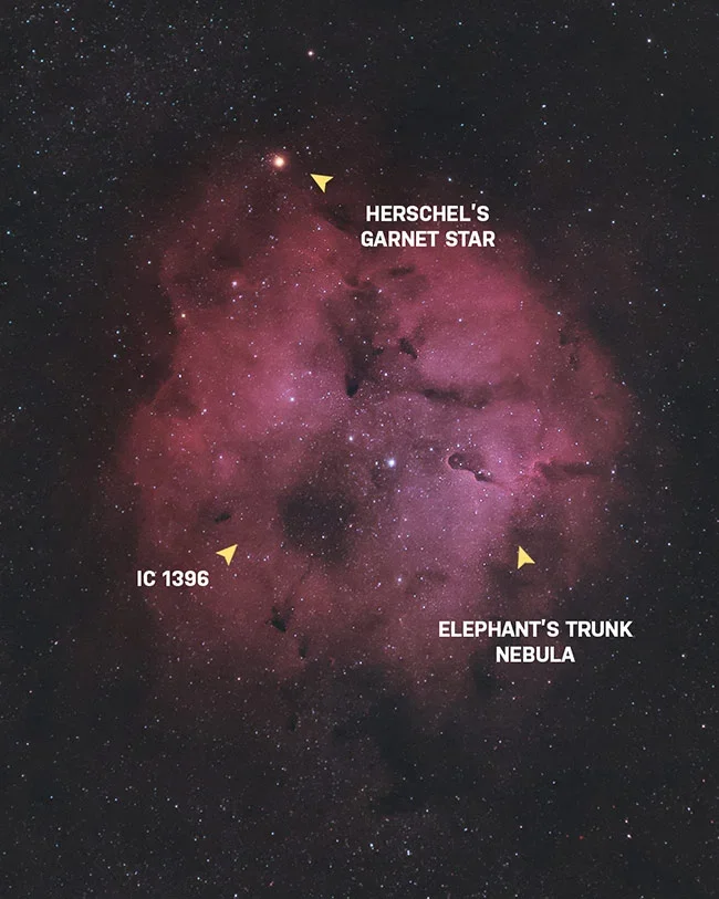 The “Elephant's Trunk Nebula” (IC 1396A) gets its name because its dark, dense cloud of gas and dust, sculpted by nearby stars, forms a shape resembling an elephant's head and long, curved trunk when viewed in visible light, showing a bright, sinuous rim against the background glow of the region in space.