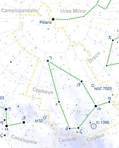 Cepheus is one of the 48 constellations identified by the Greek astronomer Ptolemy in the second century. It was named after the king of Ethiopia. Cepheus was the husband of Cassiopeia and the father of Andromeda. All three are immortalized in the night sky as constellations. It is said that Zeus placed him among the stars after his death because he was descended from the nymph Io, who was one of Zeus’ favorites. Cepheus is usually depicted as a robed king with a crown of stars. He stands with his left foot placed over the pole and his scepter extended towards his queen, Cassiopeia.