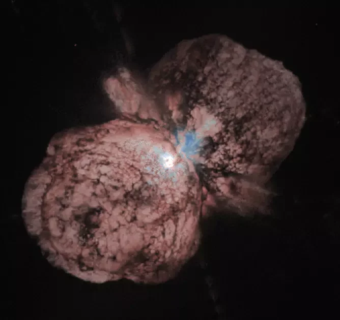 This abstract painting of the nebula within the luminous hypergiant Eta Carina — about 150 times the mass of our Sun — lies a smaller feature called the Homunculus Nebula (Latin for “Little Man”). It is harnessing immense energy, on the brink of eruption. The Homunculus Nebula is unique in the Carina constellation—and the sky—primarily because it is a recently formed, rapidly expanding "frozen explosion" (supernova impostor) that provides a direct view into the violent, ongoing life of the most massive stellar systems in the galaxy.