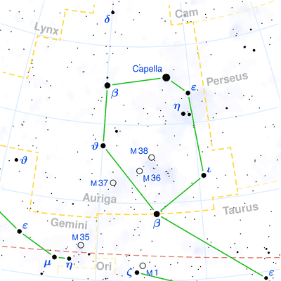Auriga is one of the 48 constellations first listed by the Greek astronomer Ptolemy in the second century. The name means “the charioteer” in Latin. It is an ancient constellation with roots in many cultures. It was first recognized in Mesopotamia as a scimitar or crook. The crook stood for a goat-herd or shepherd. To the ancient Bedouin astronomers, the constellation represented a herd of goats. The Chinese saw it as Wuche, the five chariots of the celestial emperors and the representation of the grain harvest. In Greek mythology, it represented the charioteer Erechtheus, who is seen carrying his children in his arm. This constellation is believed to have originated with the Babylonians. In some references, the charioteer carries a goat along with the two children. His other hand holds the reins to the chariot.